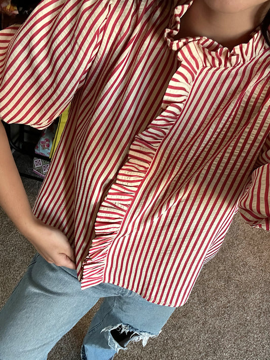 Striped Ruffled Button Down Top : Berry Red