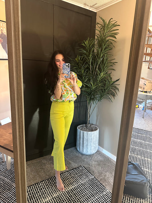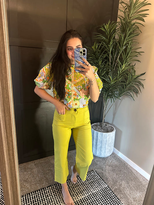 High Waist Cropped Wide Leg Pants : Lime Green