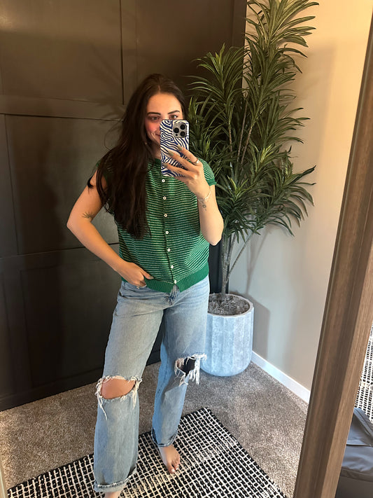 Striped Piper Vest Cardigan - Pin Stripe: Kelly Green