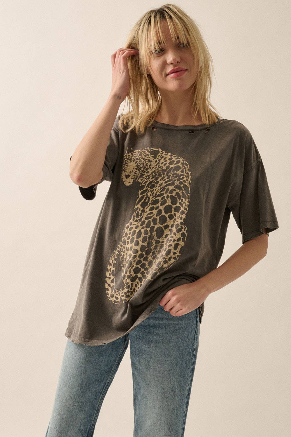 A distressed, mineral washed graphic t-shirt with the following features: Vintage-style cheetah graphic print. Round neckline. Short sleeves. Dropped shoulder. Torn and distressed detailing at neckline, cuffs, and hem. Oversized fit.