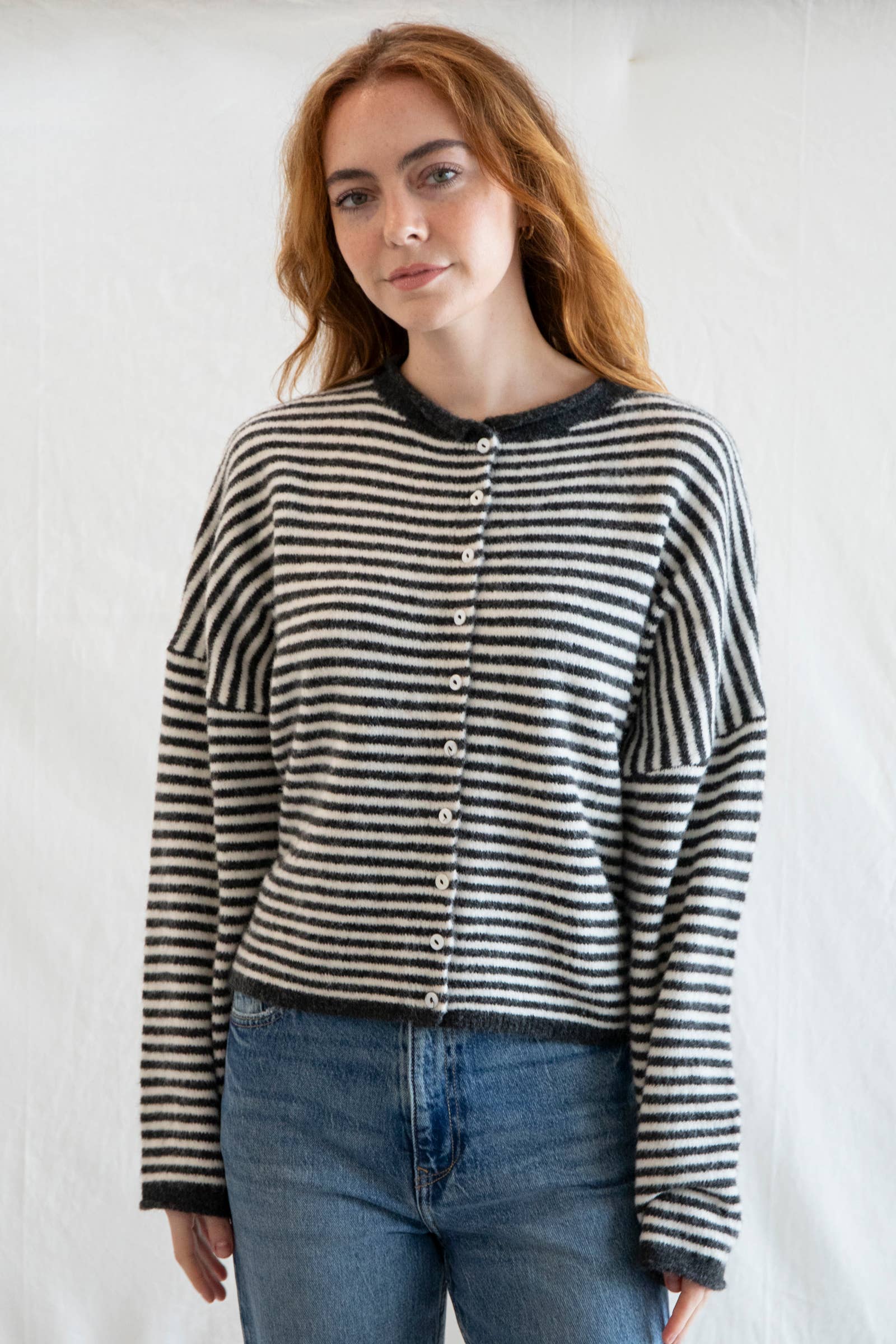 Soft and cozy cardigan in mini stripes - lightweight and rolled edge finish on the sleeves and collar.