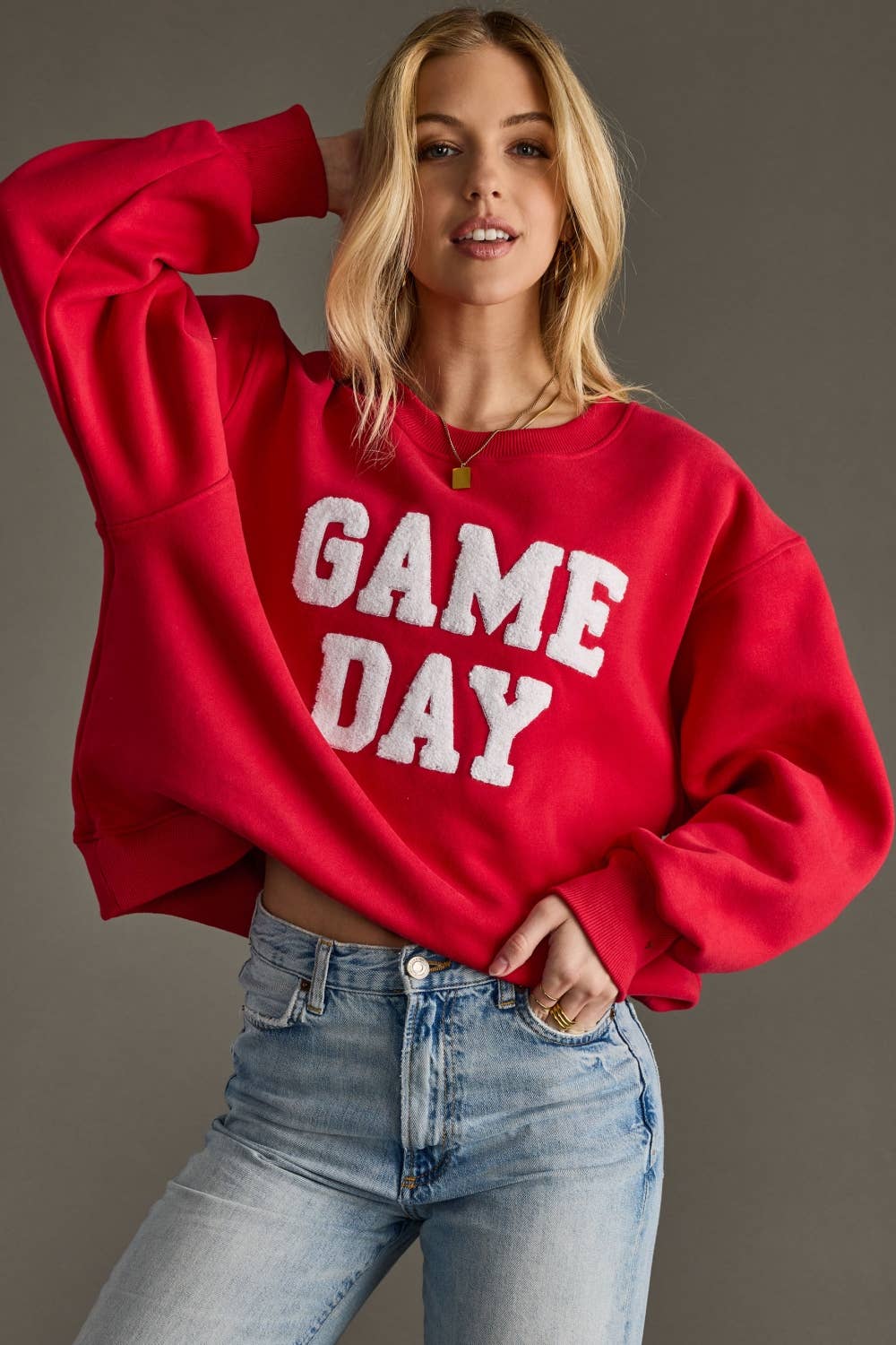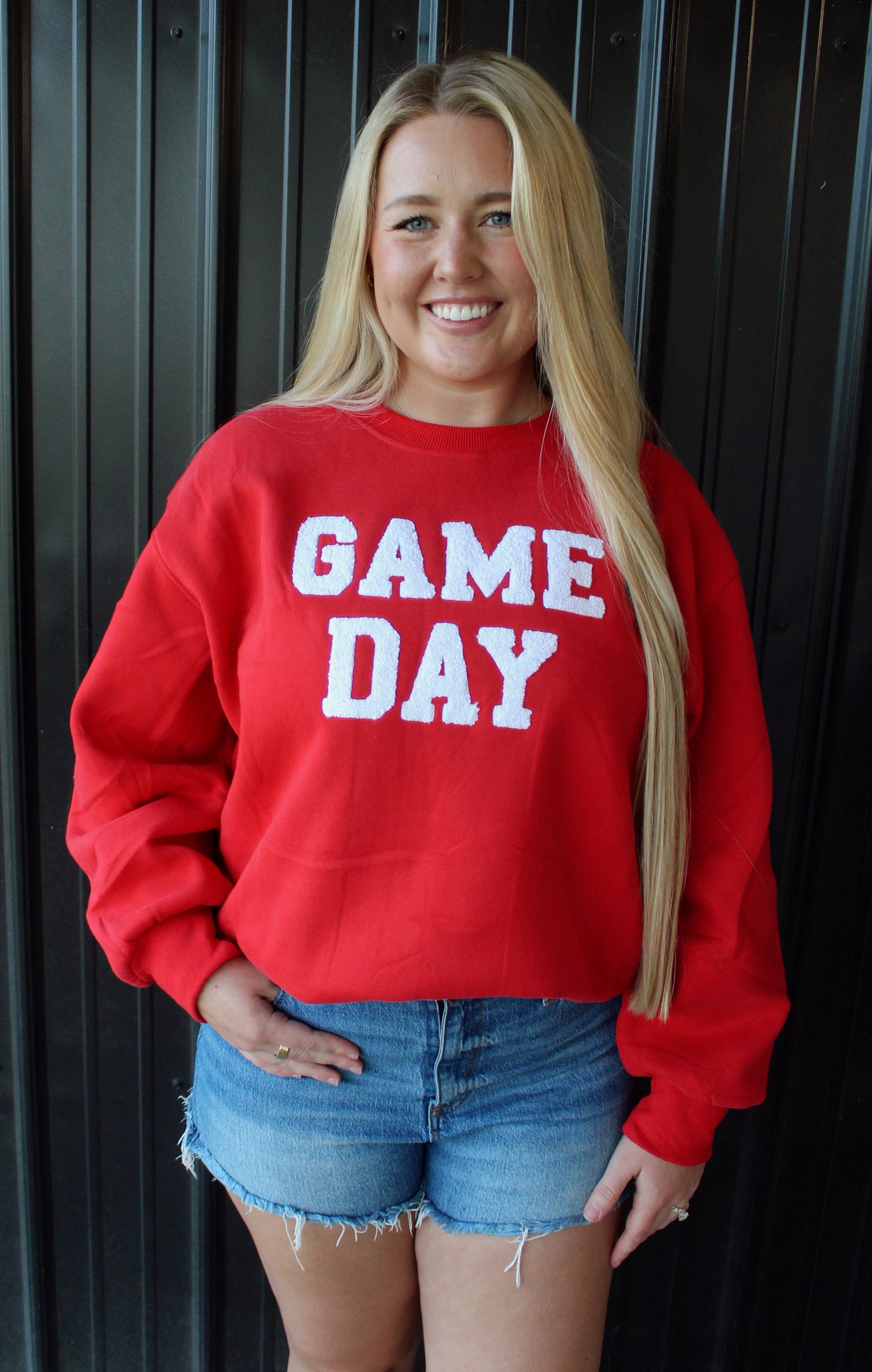 Celebrate every game day in style with this vibrant red sweatshirt featuring bold white textured "Game Day" lettering on the front. Its cozy fabric keeps you comfortable while showing off your team spirit with a cheerful, energetic vibe. Perfect for cheering from the stands or relaxing with friends.