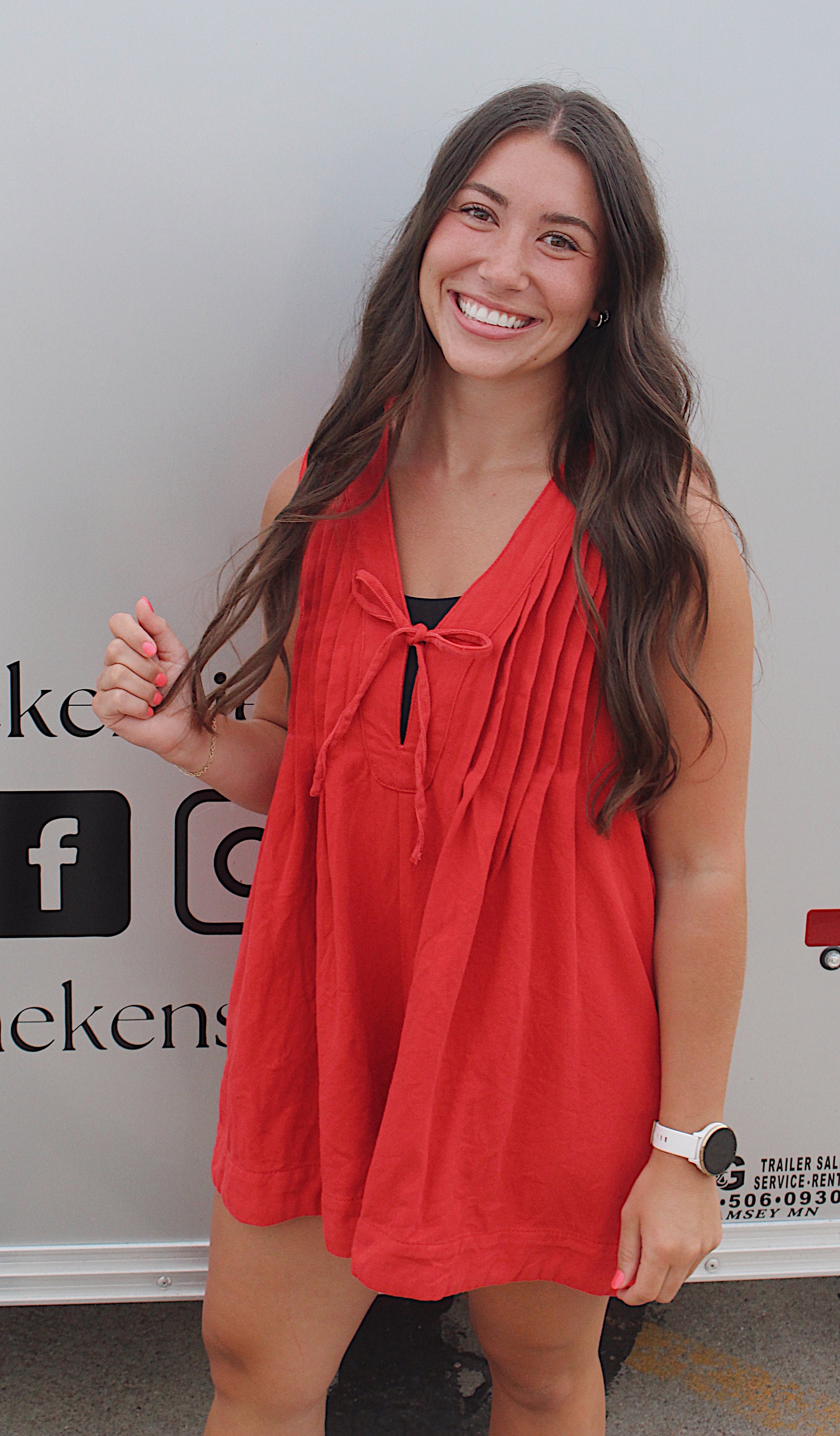 Sporty and chic, this washed red denim romper features a flattering deep V-neckline with pintuck pleats and a front tie detail. Its relaxed fit and sleeveless design make it an easy, stylish choice for warm days, tailgates, or game day. With convenient side pockets and a vintage-inspired mineral wash, it offers a worn-in, boutique-worthy look. Made from 100% cotton, this romper combines comfort and casual style effortlessly.